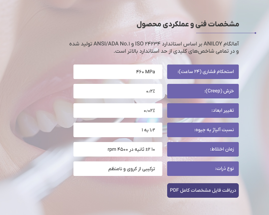 آمالگام ANILOY با فرمولاسیون پیشرفته، ترکیب دقیق نقره، قلع و مس، و ساختار ذرات کروی و نامنظم تولید شده است. این محصول فاقد فاز گاما۲ و زینک بوده و با تمامی آمالگاماتورهای استاندارد سازگار است.